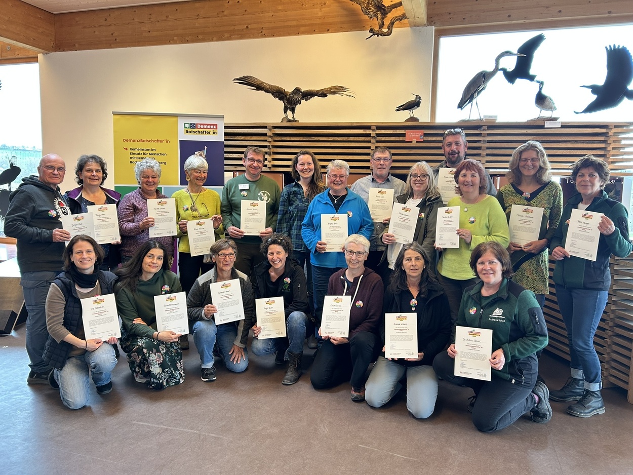 Bild1_Demenzbotschafter: Halten ihr Zertifikat in den Händen – 20 DemenzBotschafter*innen NATUR mit Ausbilderin Saskia Gladis ©Alzheimer Gesellschaft Baden-Württemberg e. V.
