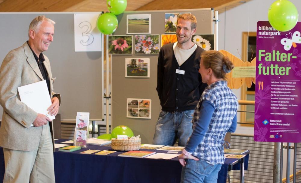 Bild 1: Über den „Blühenden Naturpark“ informieren sich Schulleiter Bernhard Ebner (Grundschule Königsfeld-Burgberg) und die St. Petermer Projektleiterin Marion Saum beim Naturpark-Mitarbeiter Holger Wegner.