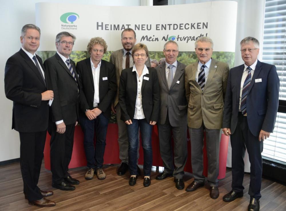 Auf dem Deutschen Naturpark-Tag 2014 in Lohr am Main im Naturpark Spessart wählten die VDN-Mitglieder einen neuen Vorstand (von links nach rechts): Landrat Matthias Wilkes; Landrat Friedel Heuwinkel; Dr. Mario Schrumpf, Naturpark Stechlin-Ruppiner Land; Roland Schöttle, Naturpark Südschwarzwald; Gudrun Rau, Naturpark Saar-Hunsrück; Dr. Klaus George, Naturpark Harz; Regionspräsident a.D. Dr. Michael Arndt; Landrat Thomas Fügmann. Nicht im Bild: Landrat a.D. Harri Reiche.