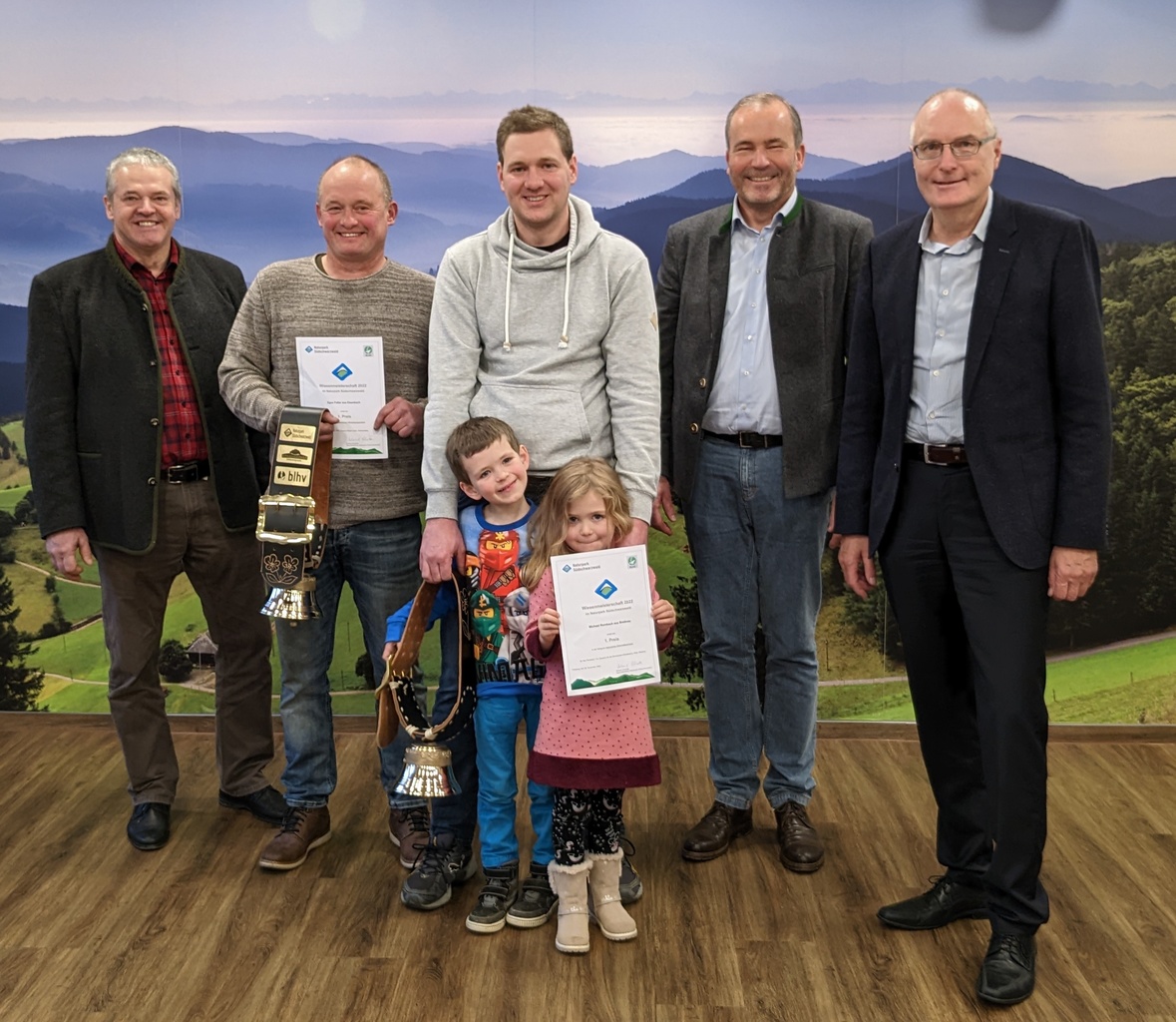 Siegerehrung im Rahmen einer Feierstunde in den Räumen der Molkerei Schwarzwaldmilch GmbH Freiburg, v. r. n. l.: Oswald Tröndle (Vorstandsmitglied des BLHV), Egon Faller (1. Platz „Artenreiche Offenhaltungsweiden“), Michael Rombach (1. Platz „Artenreiche Wirtschaftsweiden“) mit seinen beiden Kindern, Roland Schöttle (Naturpark Südschwarzwald e. V.) und Heinz Kaiser, Geschäftsleiter Landwirtschaft/Produktion/Logistik der Schwarzwaldmilch GmbH Freiburg. Bild: Naturpark Südschwarzwald e. V.